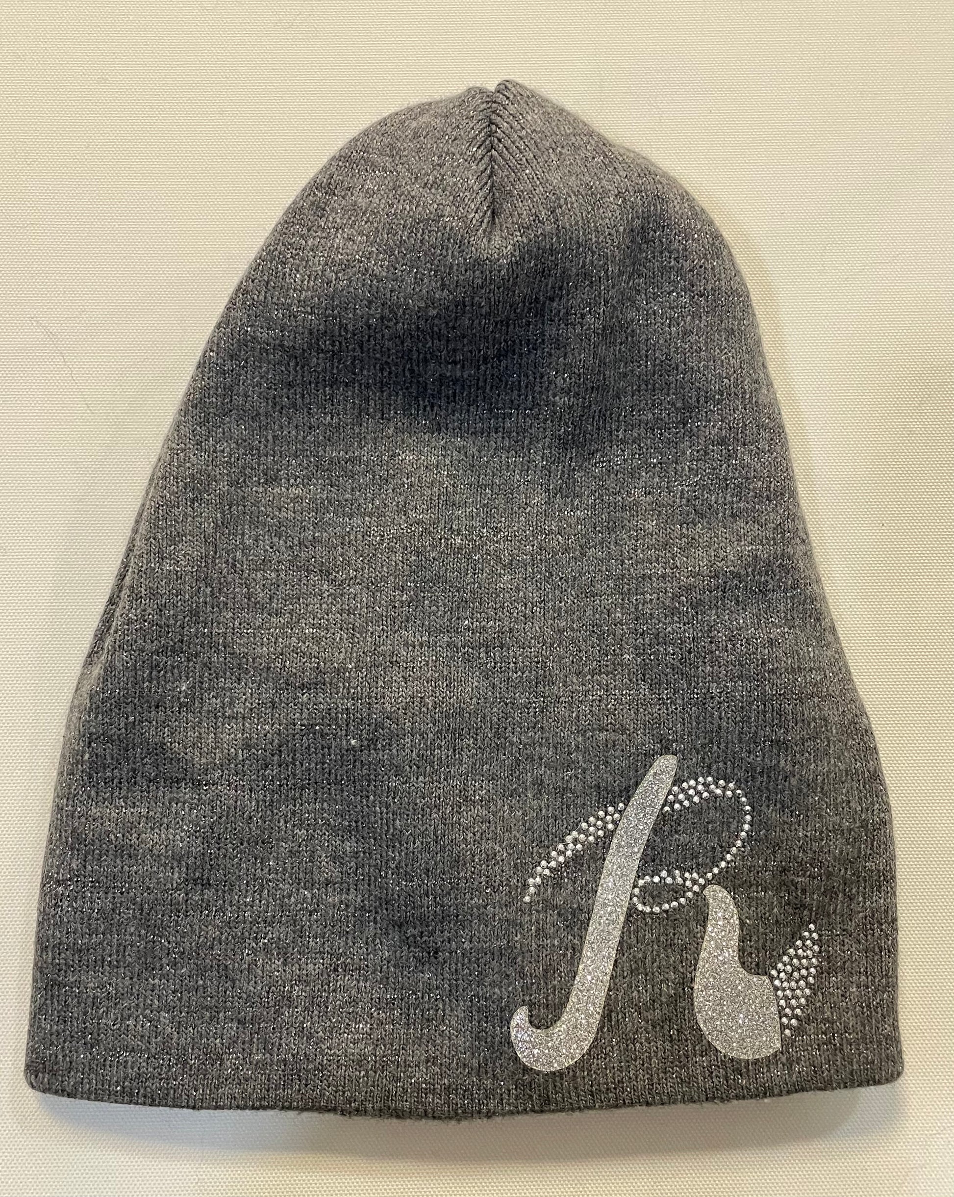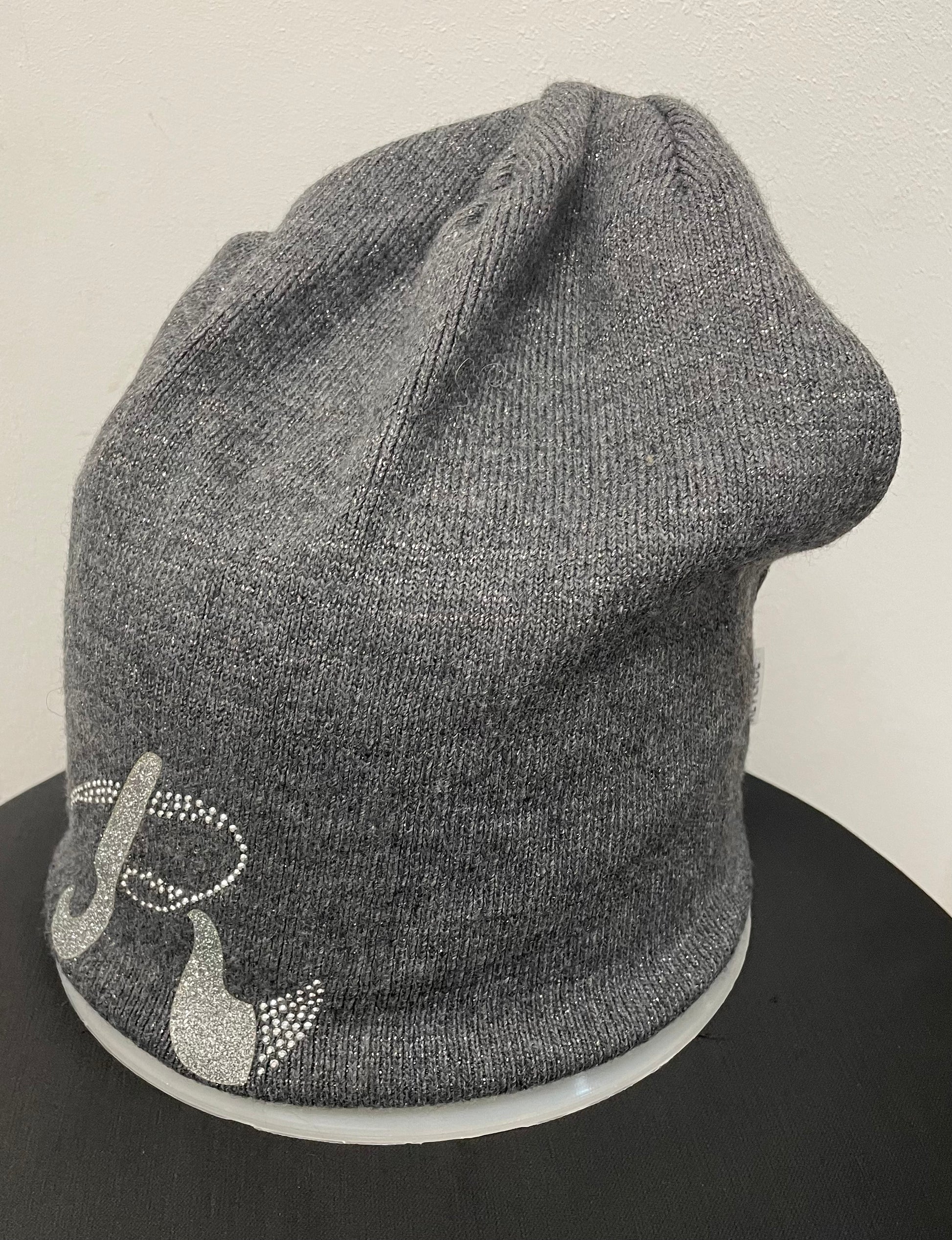 Graue Haube mit silberfarbenen Lurexfäden und Glitzersteinchen besetzt