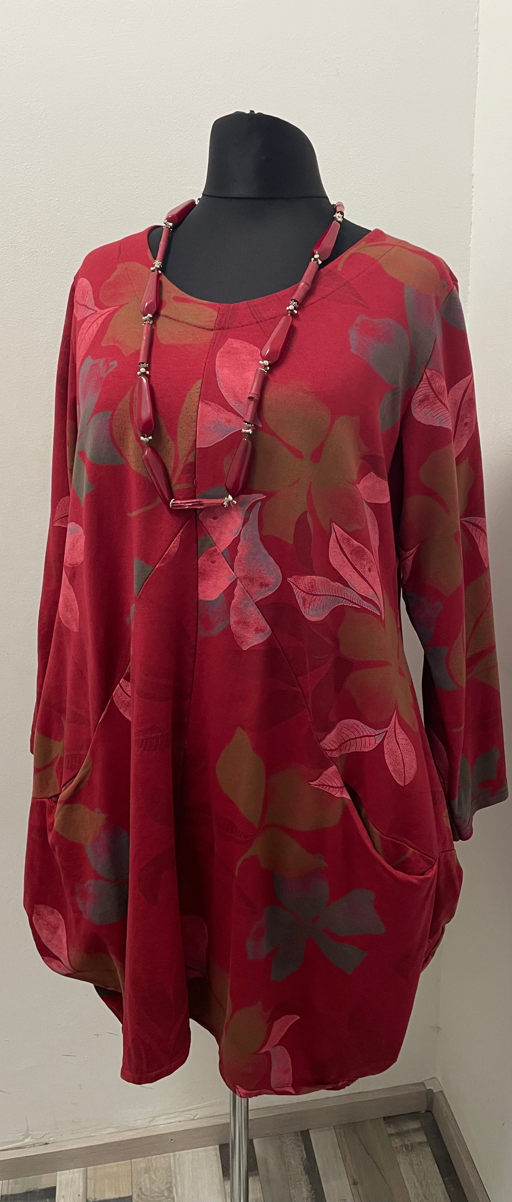 - Tunika/ Kleid mit 2 Taschen, Blättermuster in Bordeaux