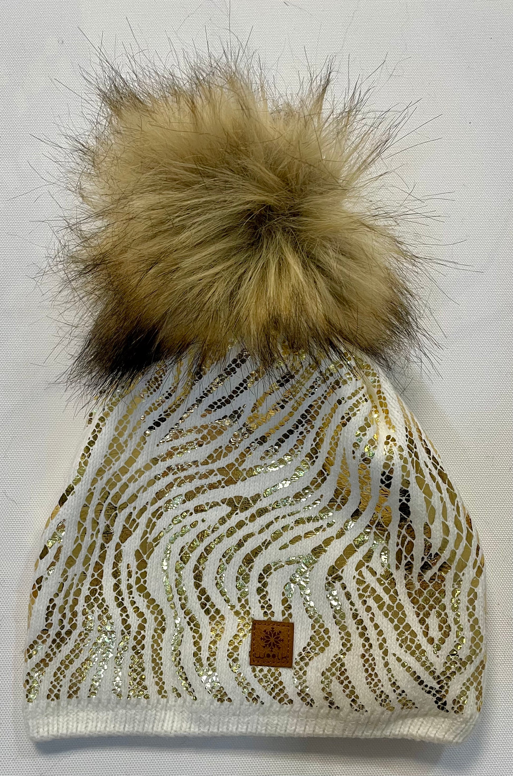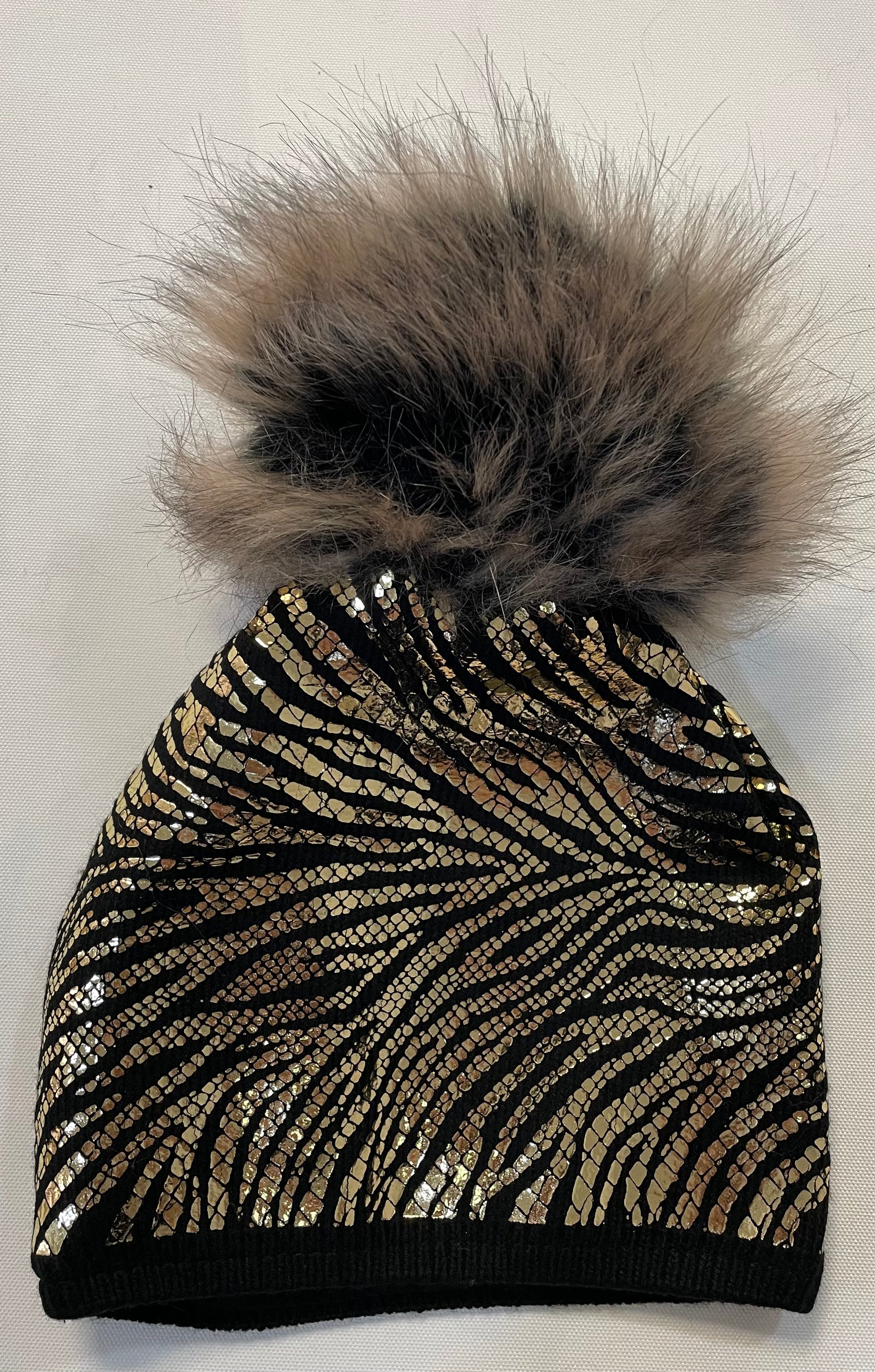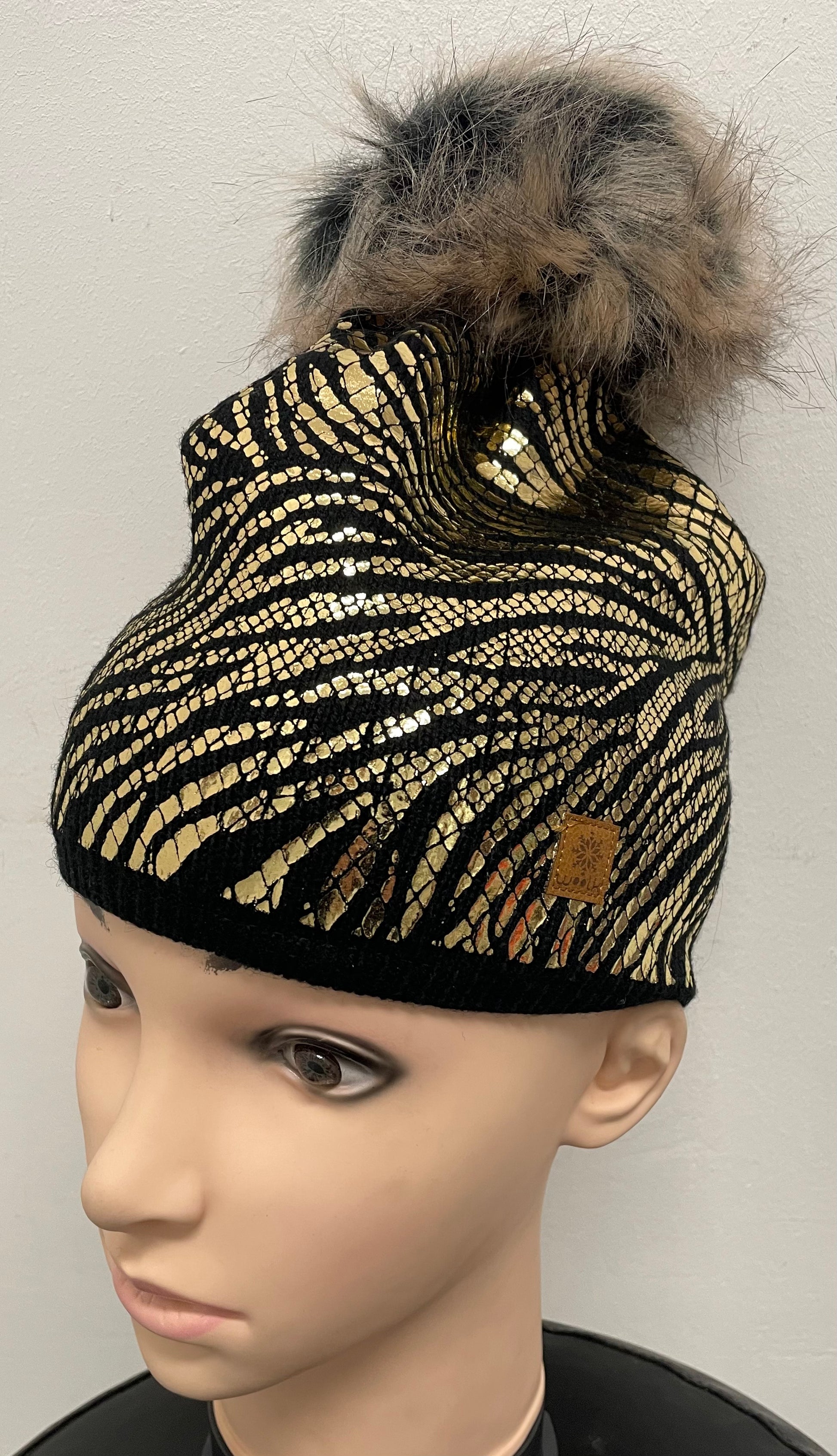 - Wollmütze mit goldfarbenen Applikationen, Fleecefutter und Bommel